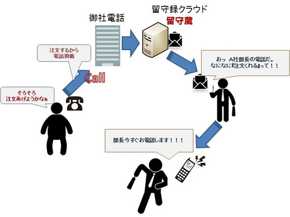 留守電即時音声メール報告サービス(留守蔵)は、録音されたお得意先様の留守電を録音終了後5分程度でお客様ご指定のメールへ、音声ファイル(MP3ファイル)で内容をご報告するサービスです。